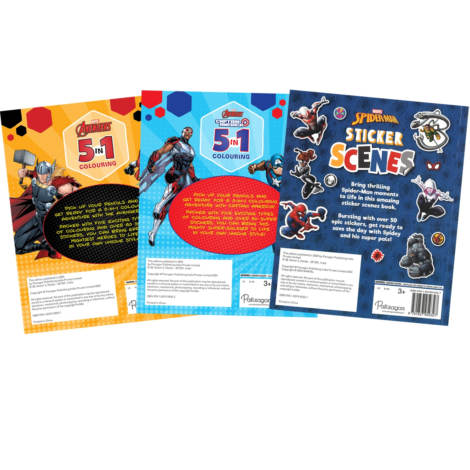 Marvel Spider-Man, Avengers and Captain America Sticker and 5-in-1 Colouring Pack of 3 Books | Stickers, Colouring and Activities for 5 to 8 Year Old Kids